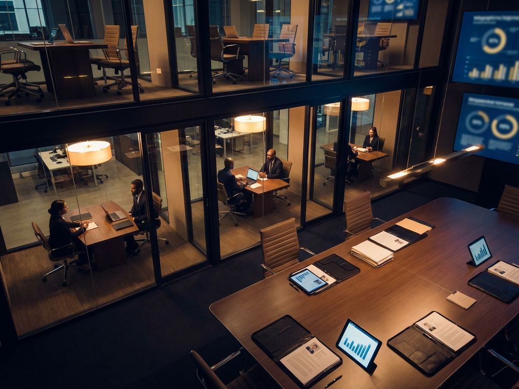 Luchtfoto van moderne kantoorruimte met glazen sollicitatiekamers, conferentietafel met cv's en professionele figuren