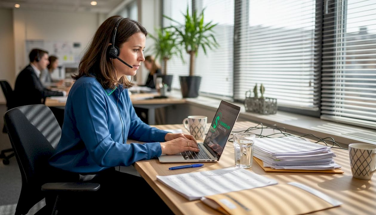 Recruiter aan het werk achter een rommelig bureau vol papieren en koffiekopjes