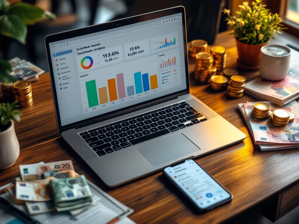Moderne werkplek met laptop met sociale media analytics, stapels eurobiljetten en smartphone op houten bureau