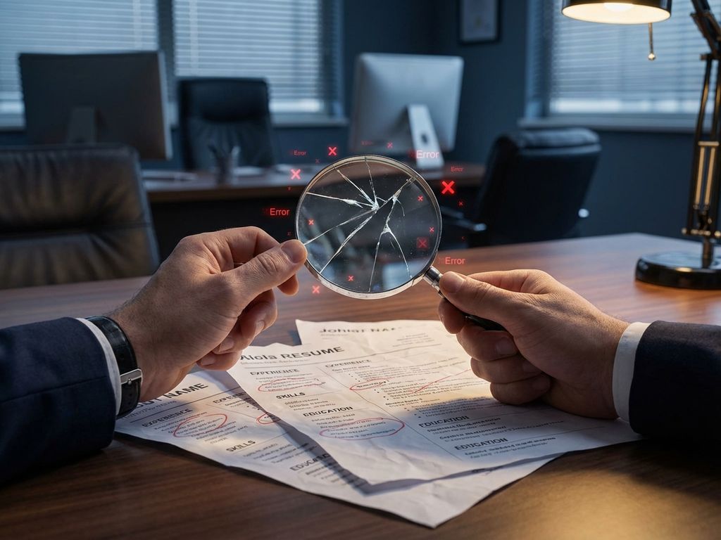 Zakenman houdt gebarsten vergrootglas boven cv's op bureau met rode waarschuwingssymbolen, symboliseert wervingsfouten