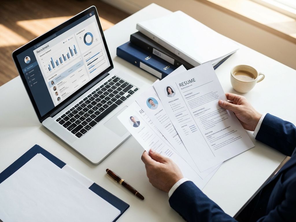 Handen van recruiter die sollicitatiebrieven bekijkt op professioneel bureau met laptop en koffie